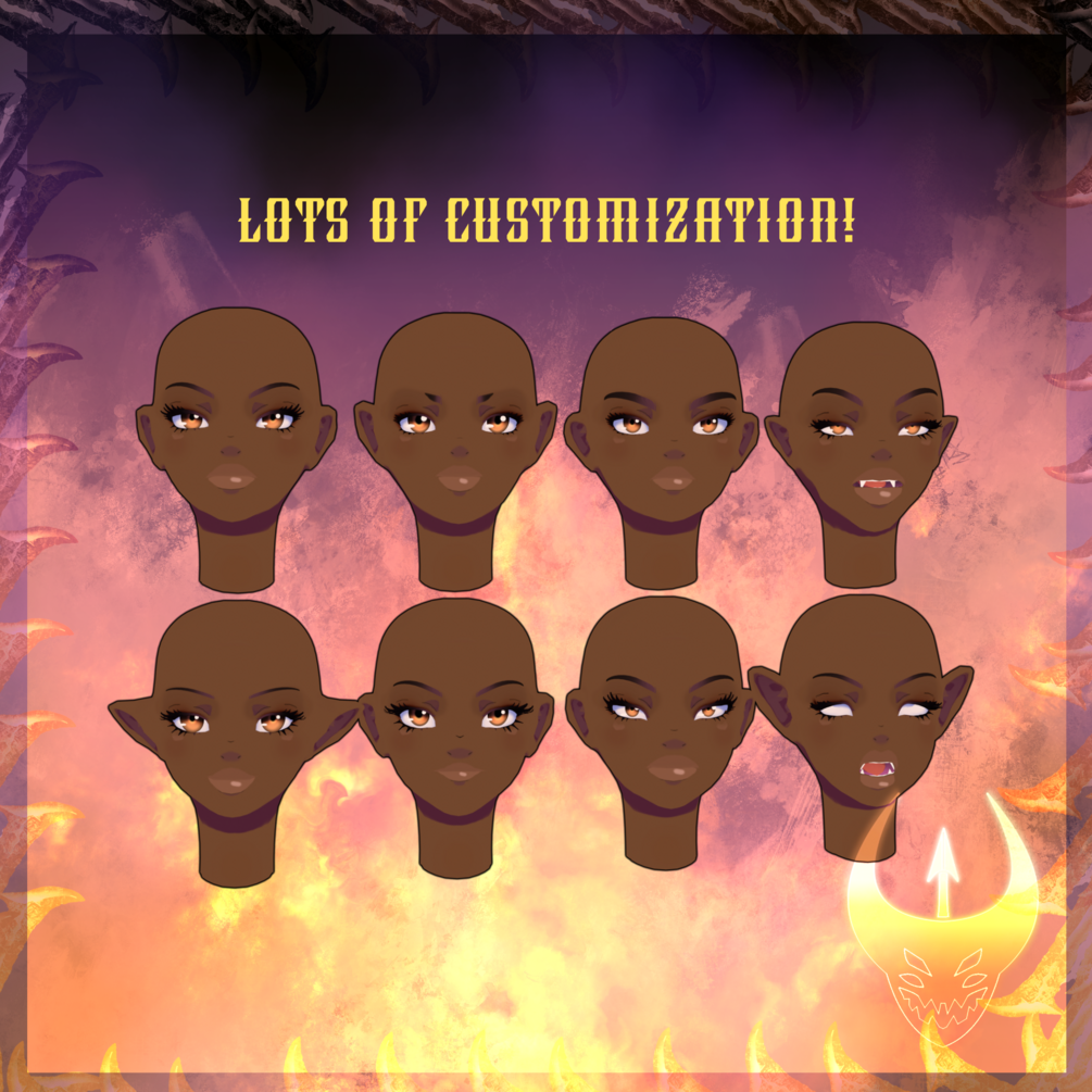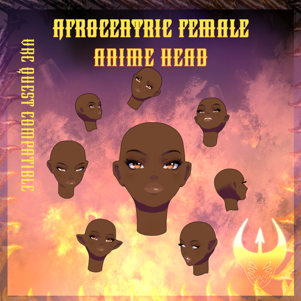 Completely made from scratch Afrocentric female anime head for VRChat. Contains lots of shape keys for visemes, eye tracking, expressions, and customization. Features 5 different skin tones, with an easy to texture UV map. Can be used for PC & Quest.